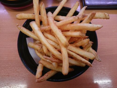フライドポテト 回転寿司スシローのポテト お値段130円 シューストリングタイプで衣がついてるポテトでした ↑メニュー表 味付けはされていないのでお好みで塩などを貰ってかけると良いでしょう 揚げたてでサクサクとした食感が美味しいポテトです ハリケーー…
